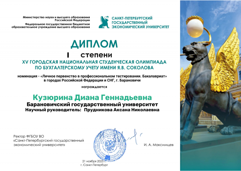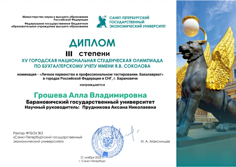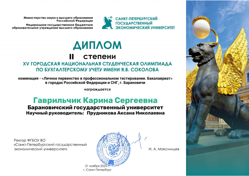 Обучающиеся 3-го и 4-го курсов специальности Бухгалтерский учет, анализ и аудит факультета экономики и права приняли участие в XV Городской национальной студенческой Олимпиаде по бухгалтерскому учету имени Я.В. Соколова, организованной кафедрой бухгалтерского учета и анализа ФГБОУ ВО «Санкт-Петербургский государственный экономический университет».
