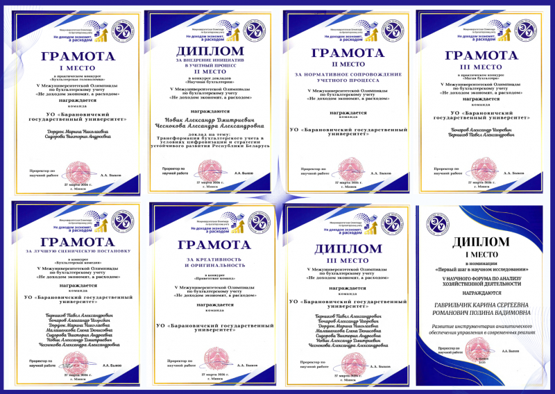 27 марта 2026 года обучающиеся 2-го и 3-го курсов по специальности 6-05-0411-01 Бухгалтерский учет, анализ и аудит факультета экономики и права приняли участие в V Межуниверситетской Олимпиаде по бухгалтерскому учету «Не доходом экономят, а расходом» и Научном Форуме по анализу хозяйственной деятельности, проводимых на базе учетно-экономического факультета учреждения образования «Белорусский государственный экономический университет».